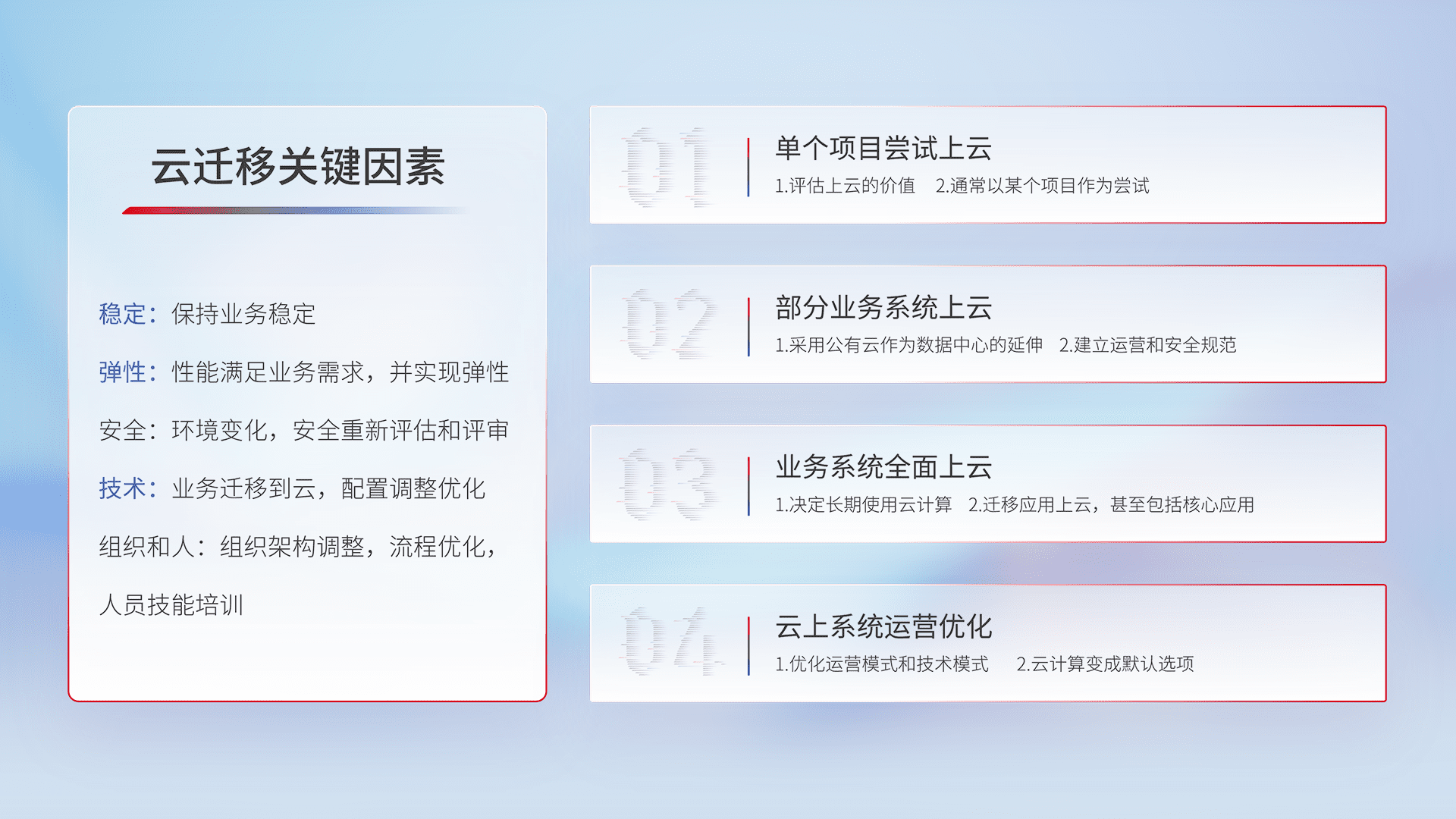 结合实际业务,,,,从规划设计、、云平台选型、、、、云原生改造、、数据迁移、、集成交付,,迁移全过程为客户识别最佳上云路径,,做好风险识别管理,,,,设计网络架构、、、身份权限、、、安全审计合规、、操作审计、、、、日志审计、、、监控告警策略、、多站点容灾设计等,,对云上基础设施进行整体规划,,,,提升IT治理水平,,,,以满足弹性、、、、高可用、、、高性能的需求。。