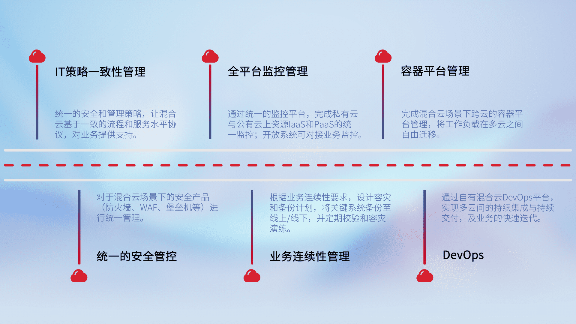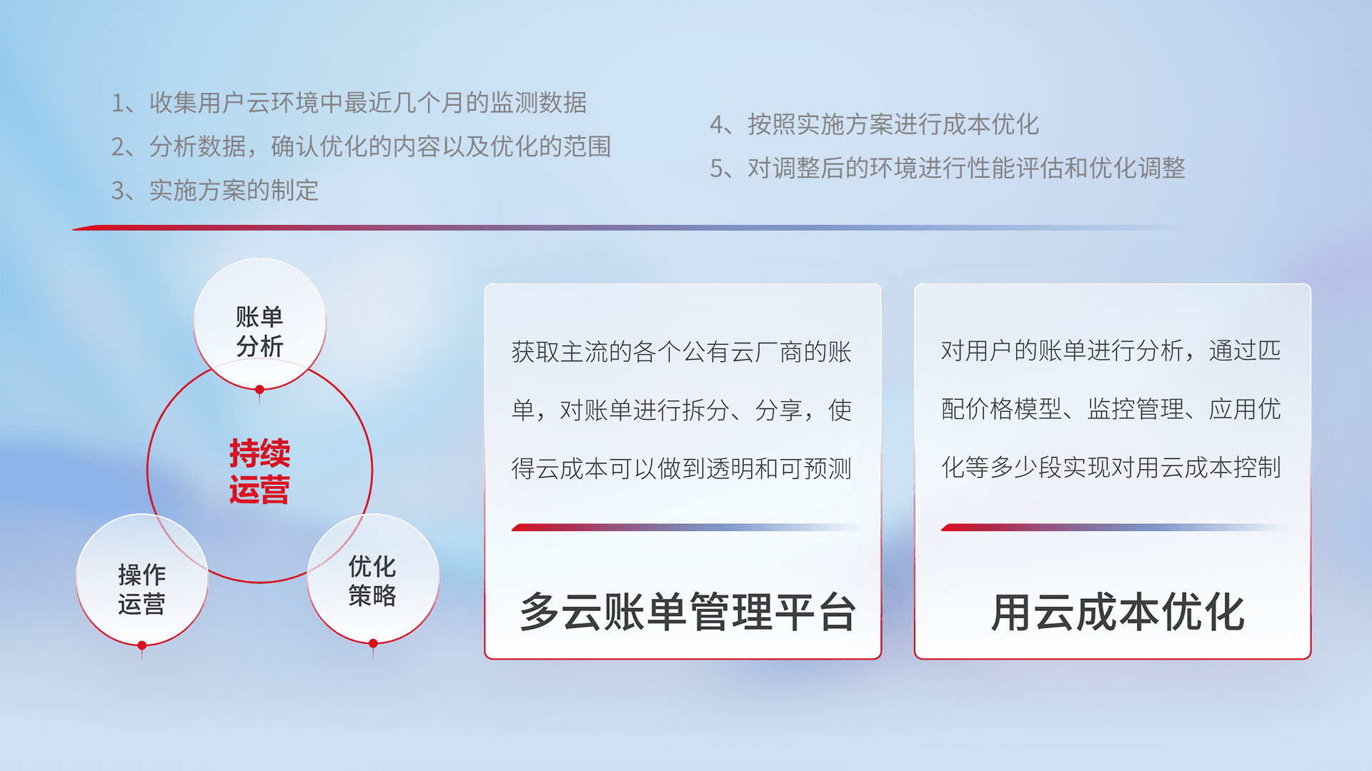 通过多云纳管,,,,以统一的资源数据模型把客户的云资源进行抽象和封装,,,,进而实现对多云资源的统一操作,,,保障云资源管理的可靠性、、稳定性与可用性。。量身定制化运维内容,,,配置、、、、开发运维、、、补丁管理、、备份、、监控、、认证和访问管理、、、、审计和日常巡检等,,,,保障在用云过程中的可靠度,,稳定度以及高可用率。。。