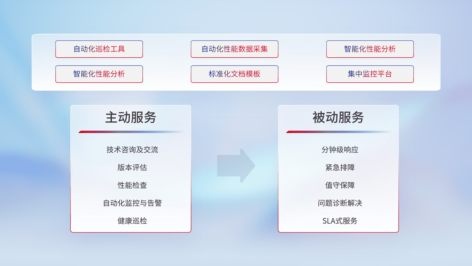 智能化工具和标准化文档,,,,保障服务质量,,提供主动服务(包含技术咨询、、、、版本评估、、、性能检查、、自动化监控与告警、、、健康巡检)和被动服务包含(分钟级响应、、紧急排障、、、、值守保障、、问题诊断解决、、、SLA服务)。。
