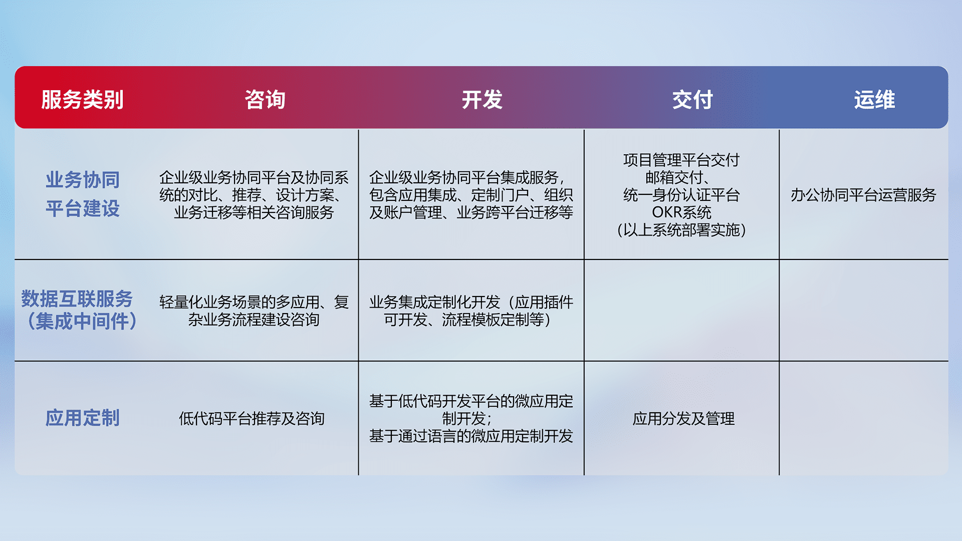 针对钉钉、、企微、、IDaas等平台级产品提供产品的规划、、、方案、、、、交付、、、、定制化开发等服务,,,,实现如统一协同办公、、、智能客户服务、、、、混合会议管理、、、、智能数据查询、、、、等业务场景,,,,实现数字化转型。。。。